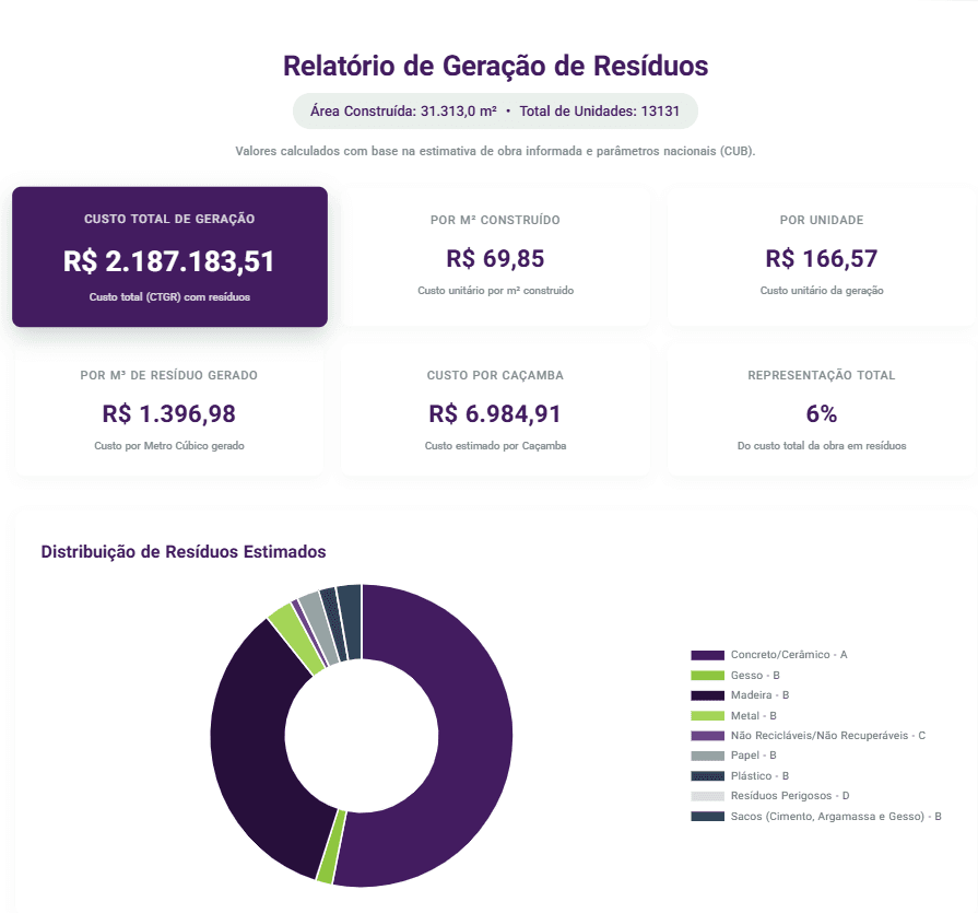 Em poucos segundos, estime o volume de resíduos a ser gerado e o impacto direto no custo de sua obra usando nossa ferramenta baseada em dados reais de grandes construtoras.